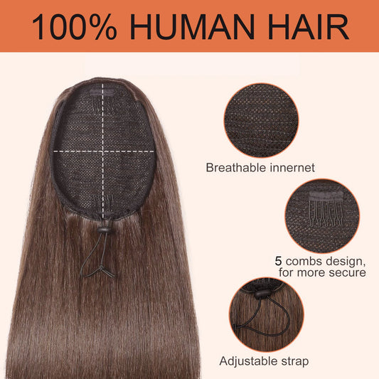 Brazilian Human Hair Long Ponytail Straight Drawstring Ponytail Color #4 Medium Brown 16-26 Inch